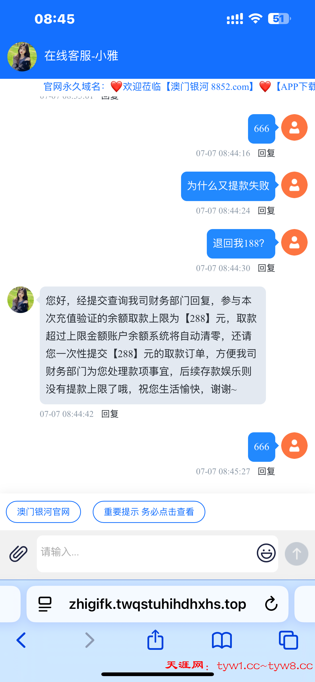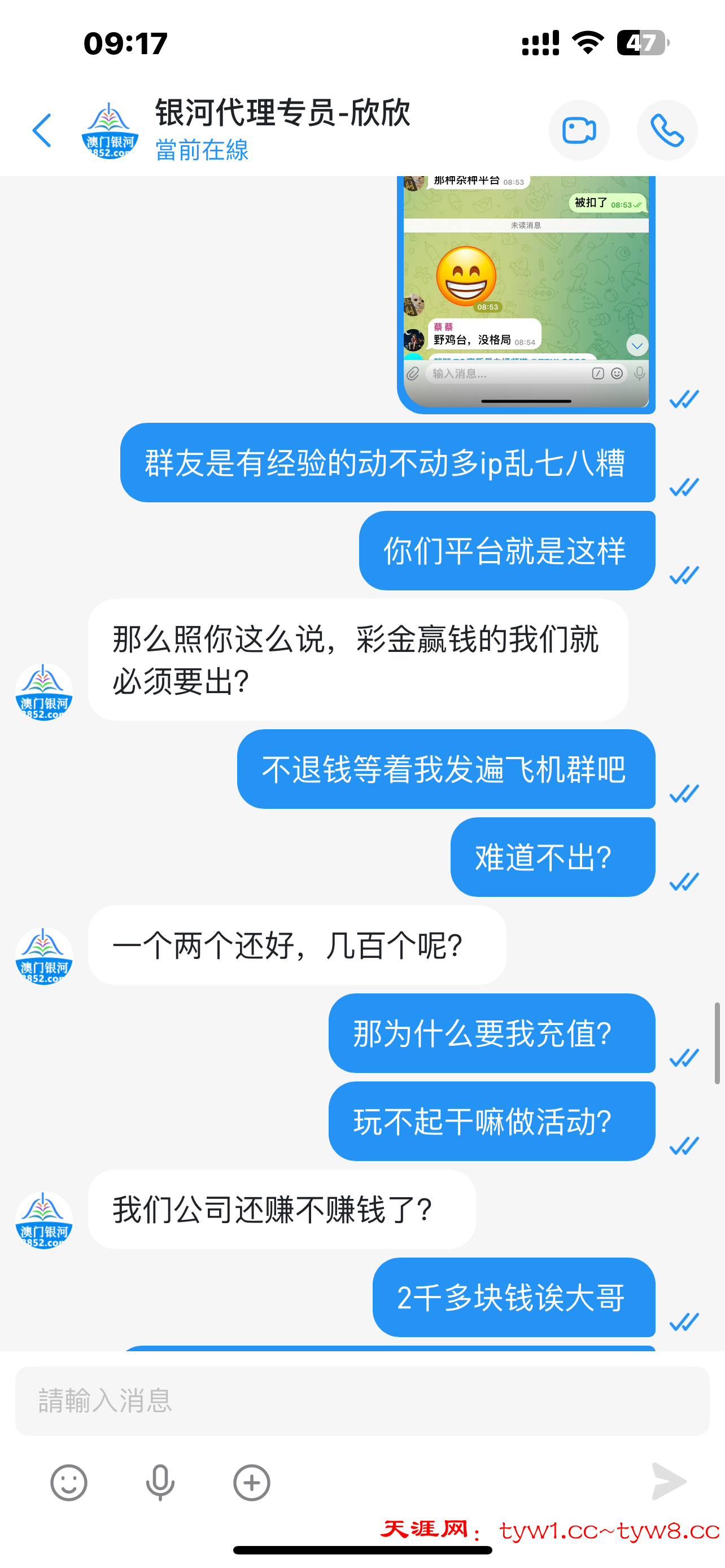 8852澳门银河穷比台2800都出不起,刚开始我拉人推广的50彩金是可以直接提现的,然后我没提打到了400提款,然后客服说要充值100打三倍流水就可以全部提款了,我充值了100打完三倍流水余额是2800然后申请提现,直接扣除2512,只给我出288,问客服怎么回事,他说验证充值只可以提288,这不是扯淡吗?我400的时候说充值100验证,赢钱了就说只可以提188,后来客服直接说他们公司也要赚钱,明摆着不给出还说什么彩金就是这样,一套一套来,贵公司看见可以直接来和我对峙别鸡巴狡辩所有截图我都留着,2800块钱都出不起开什么台子,让我充值我充值了,让我打流水我打了,最后赢钱给我说什么充值验证只可以提288,老子充值就充值你扣我钱搞你雷母啊?