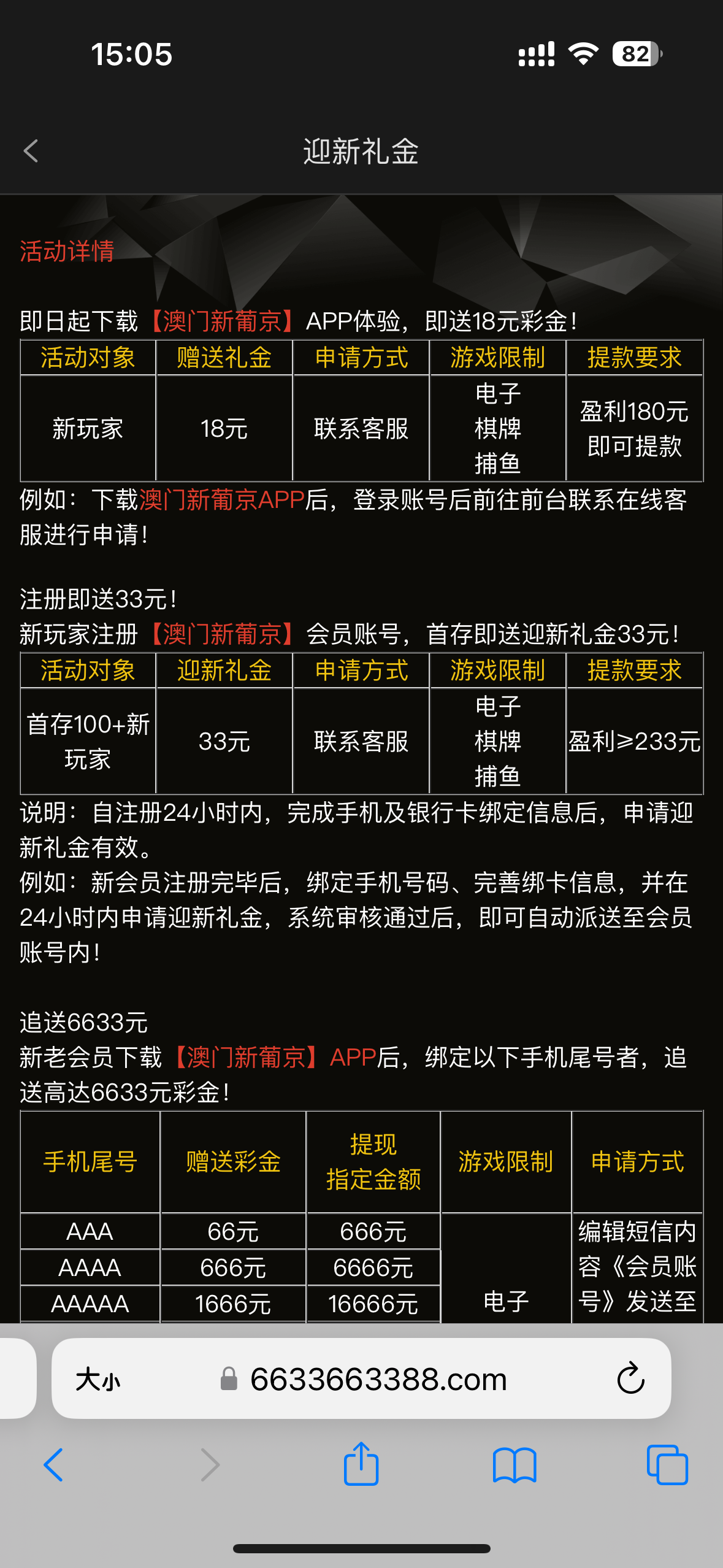 凌晨没事做,逛看到这个6633有新人注册活动就去碰瓷了,给了18没打出来 ,参加了100+33打出来295。我没收到短信单纯碰瓷碰到的,没事的可以去试一下,链接6633.com