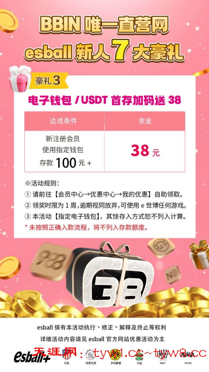 凡新注册会员,使用指定钱包,首次入款100元以上,即可获得奖金38元