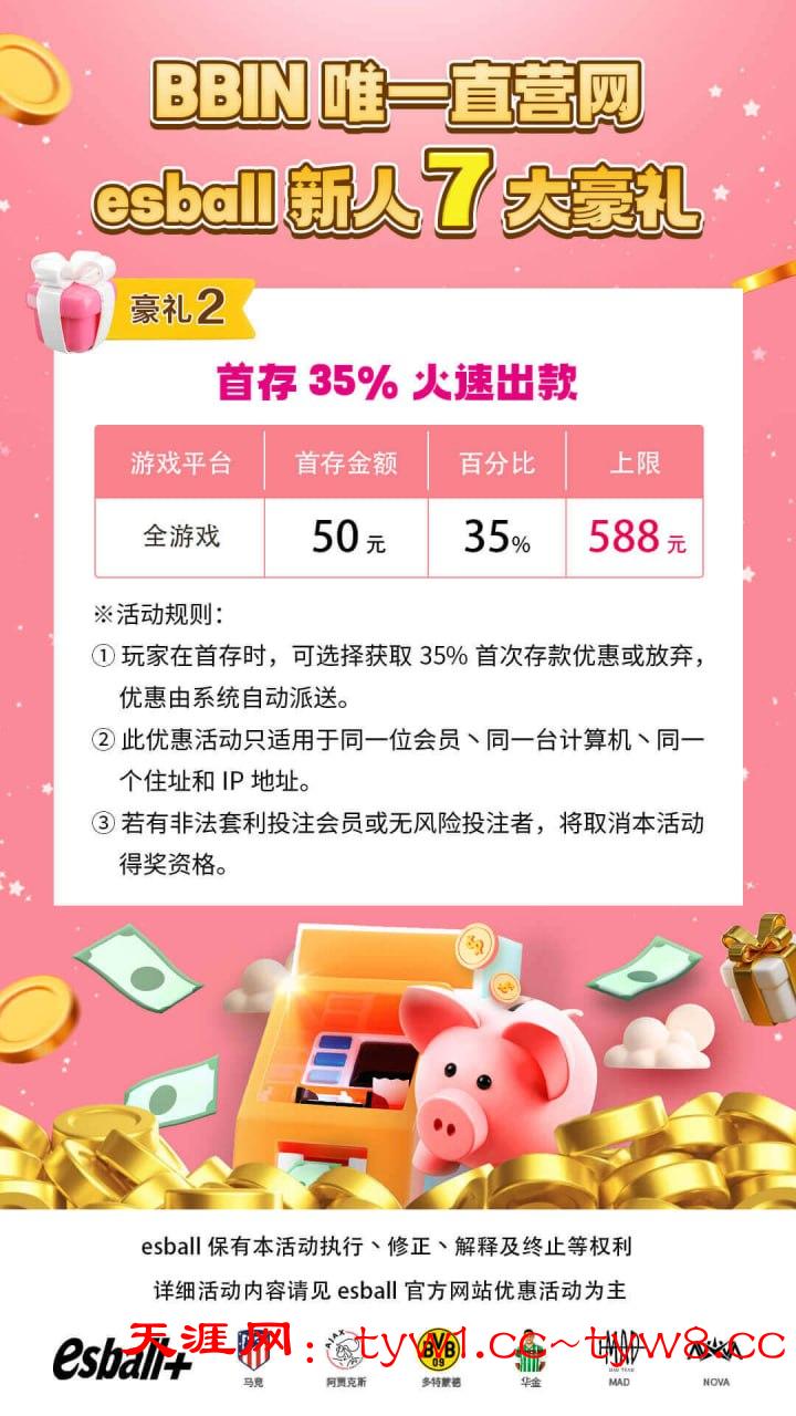 首存可获取35%首次存款优惠,最高588;出款流水:(首存本金+优惠)*20倍 (可不参与此项)