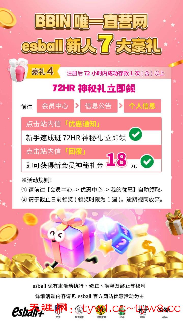 【注册72小时内➜成功存款1次(含)以上】,回复站内信领取神秘礼金18元!
