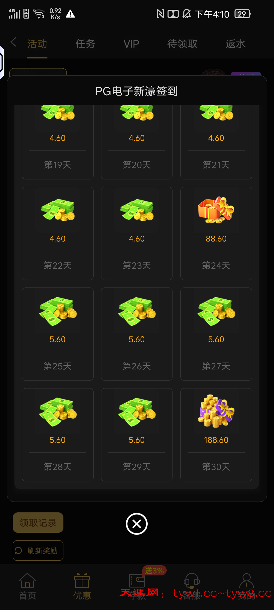 接到电话,说每日签到彩金,看了一下连续签到6天给6.6,12天给18.6,18天给38.6,24天给88.6元,30天领188,签到没有门槛,这个是特邀给的,有号的自行上去看看是不是有特邀门槛,出款自测!