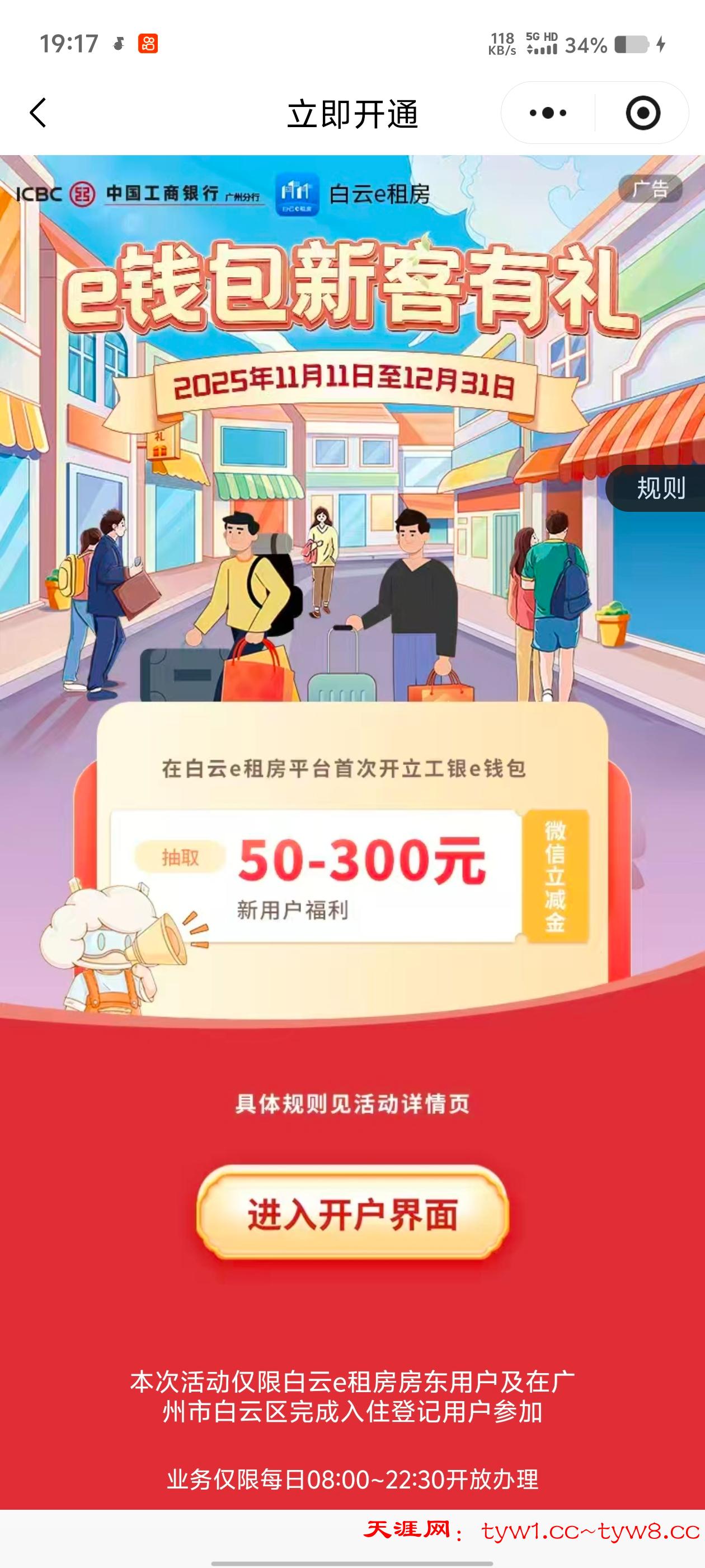 【e钱包开户送50立减金】 活动规则限制广东地区 不在广东地区可以用幻影分身登录微信