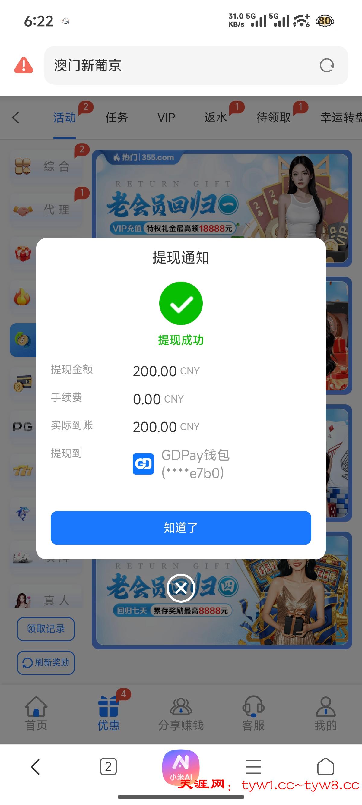 应该是之前注册过,充没充值忘记了,今天想找以小博大的平台,找到这个台了,登录进去一看有188,我看记录是电话彩金,系统派送的,有号的可以登录查看一下。提现200到账了