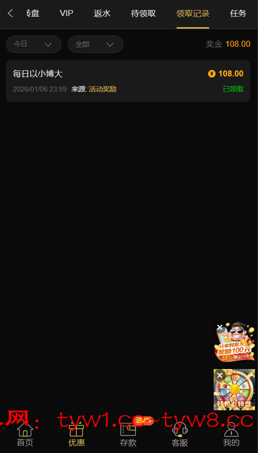 之前看论坛发出来白嫖的18彩金的,现在没白嫖彩金了。但是有首存之前撸到过一次588。昨晚看到改成每日可以参与了。
