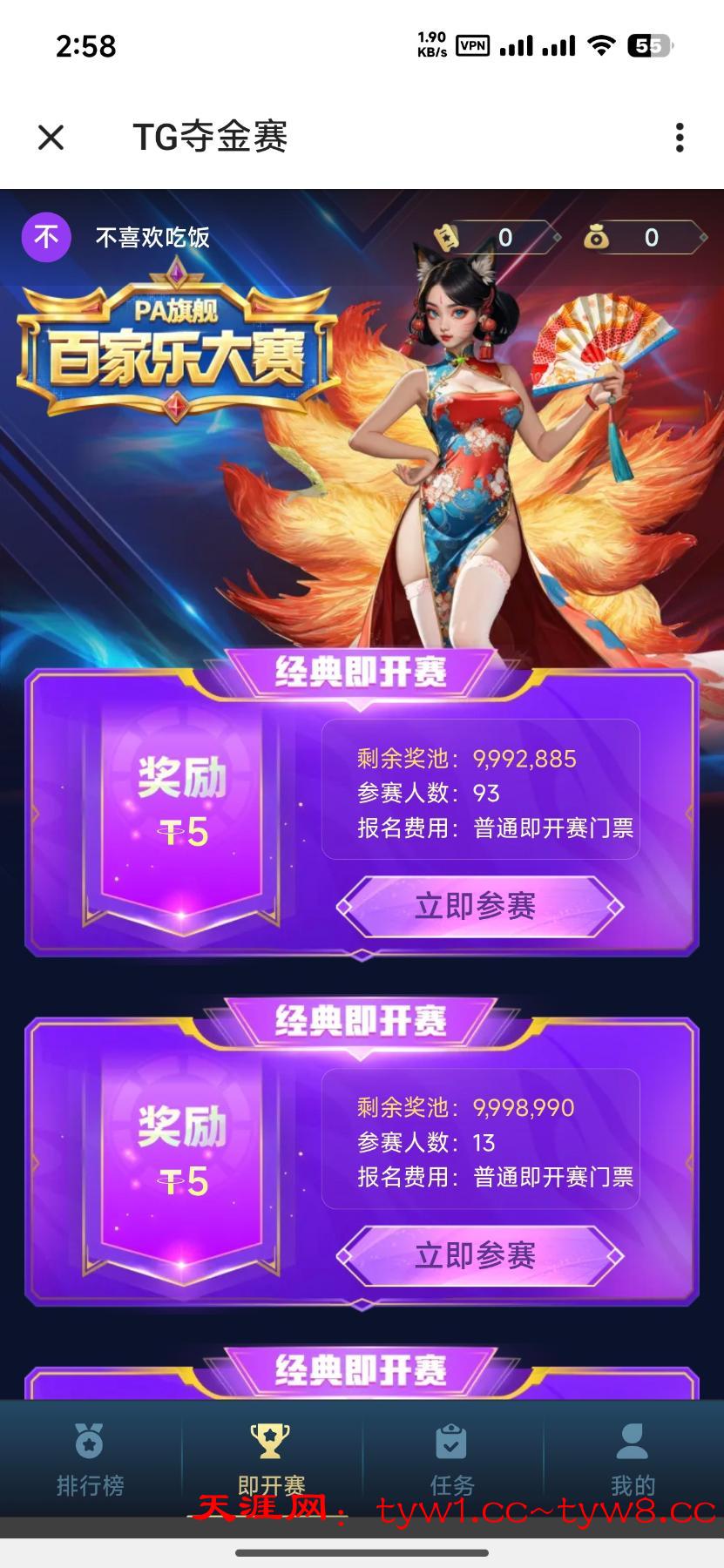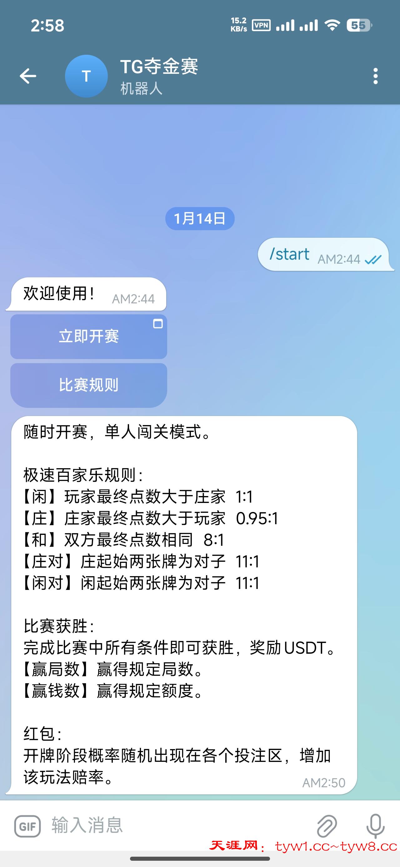 点击机器人发起聊天〈立即参赛〉进入应用后点击〈任务〉〈签到领取门票〉获得票后即可参赛,每人100万筹码,10局比赛赢得5局且赢得5万筹码即可获得奖金5U[每日签到皆可获得门票]