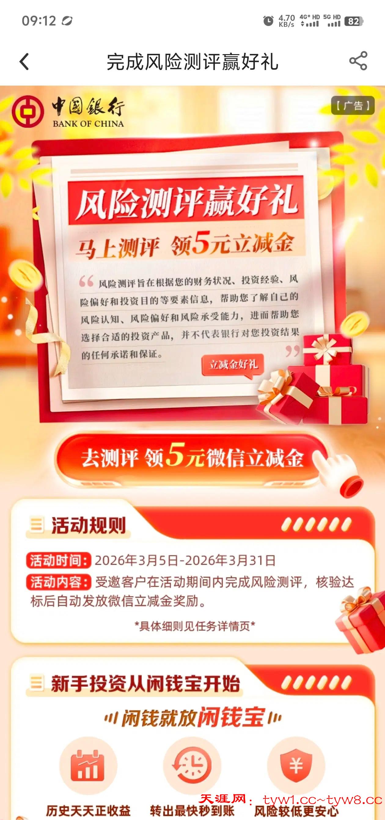 在中国银行app活动页面,完成评测就送5块微信立减金