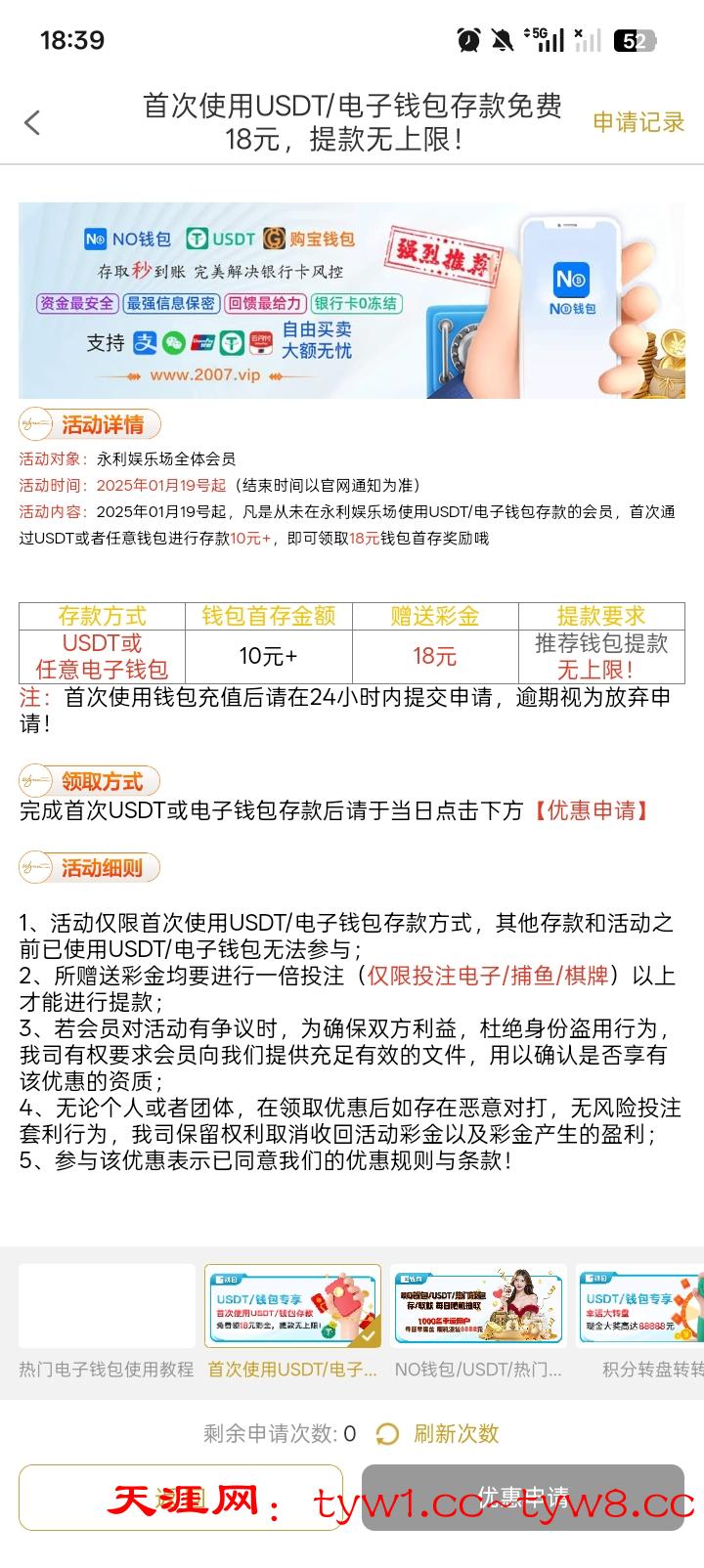 钱包充值10块,申请18,一倍流水满100就可以出,链接2007.vip