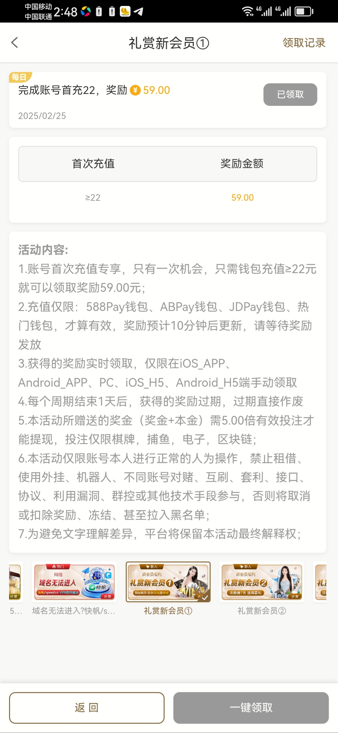 2259 新账号充值22送59 5倍水 亲测提现秒到