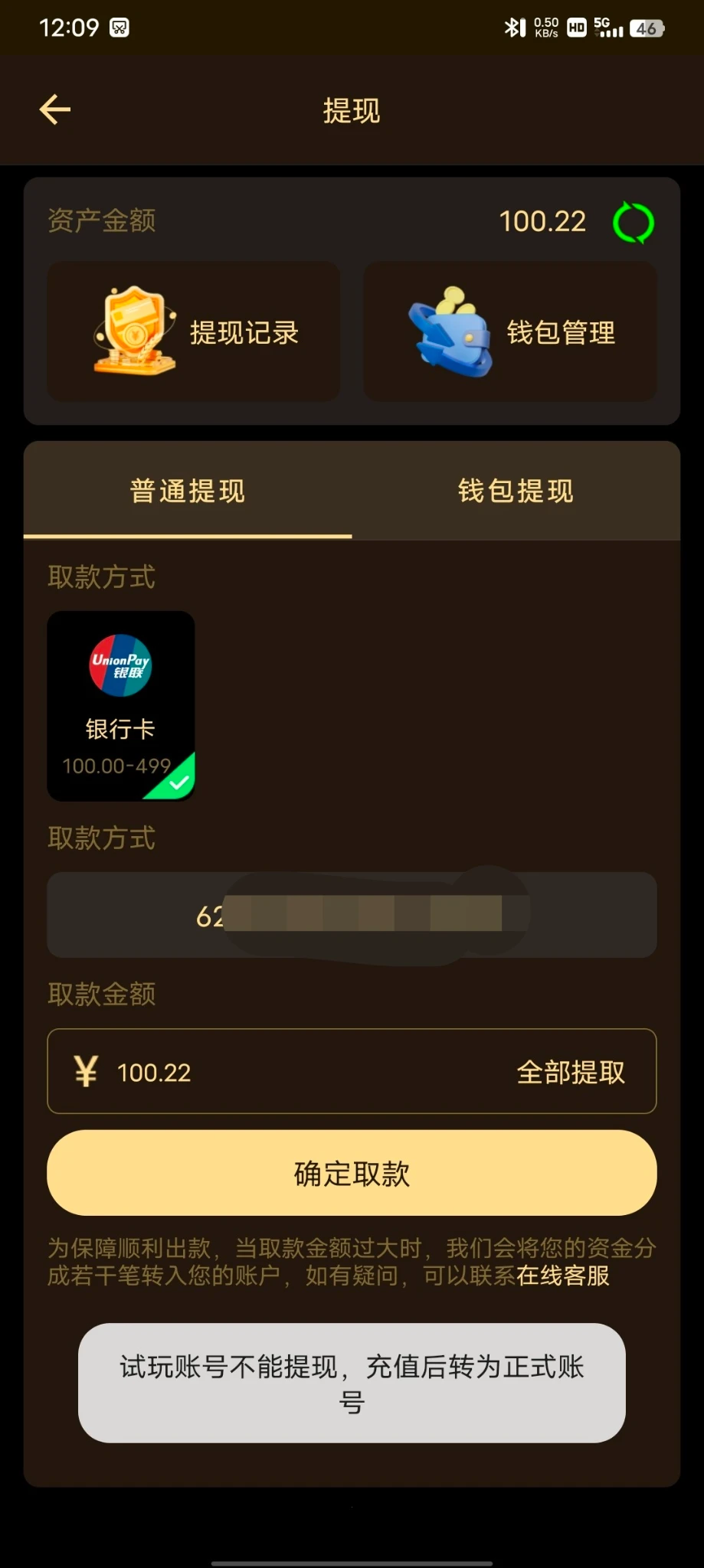 限制电子/棋牌/捕鱼,最低100提现。