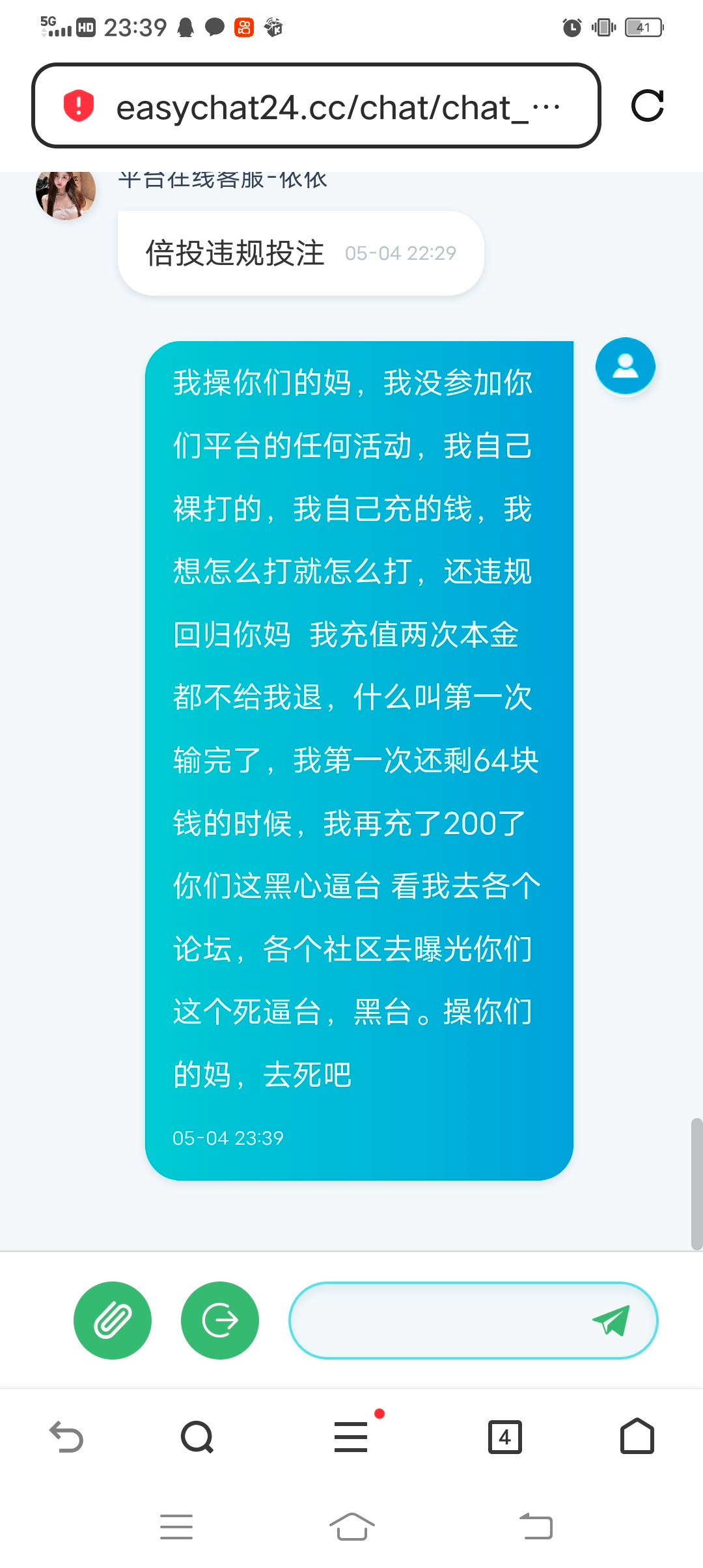 我充值两次200,然后自己裸打的没参加任何活动,提现的时候他以活动扣除为由把我600吞了 最后找老大让他给我全部退,他不肯只给我退200 这个傻逼说我打百家乐违规,我自己裸打的,我想怎么打就怎么打,我又没参加他们任何优惠,傻逼黑台