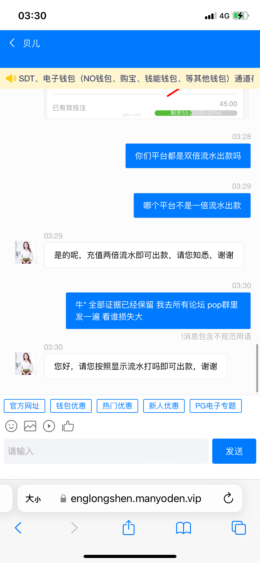 充值五十裸打双倍流水出款 后面平台跟我说他们就是双倍流水出款 所有证据保留了 大家注意避坑就是了 别无所谓说不定下个就是你